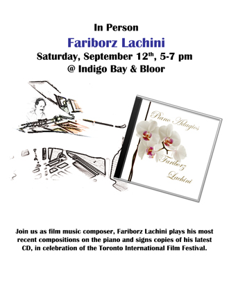 Sep. 12, 2009 - 5pm Fariborz Lachini @ Indigo Books & Music Bay&Bloor Join us as film music composer, Fariborz Lachini, plays his most recent compositions on the piano and signs copies of his latest CD in celebration of the Toronto International Film Festival.